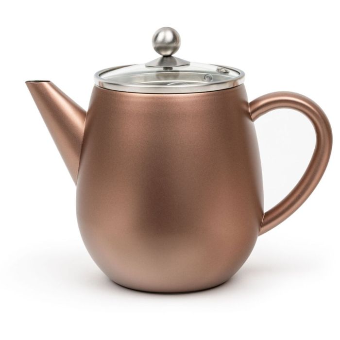 - Dubbelwandige theepot in elegant roestbruine RVS‑afwerking met warme uitstraling.