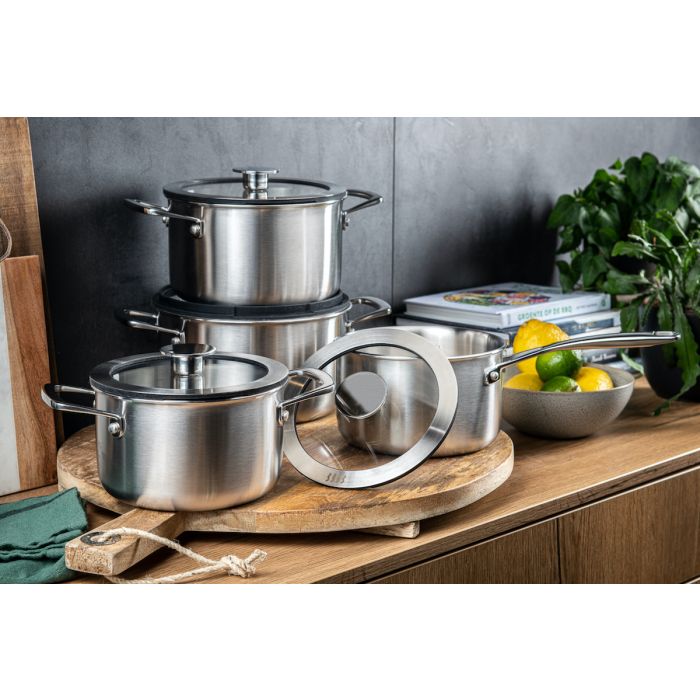 De pannen zelf bestaan uit drie lagen: inductiestaal aan de buitenzijde, roestvrij staal aan de binnenzijde en een aluminium tussenlaag. Deze lagen zorgen er niet alleen voor dat de warmte goed verdeeld wordt, maar maken ook dat de pan prettig vasthoudt zonder dat deze te zwaar is. Dankzij de speciale bodem van inductiestaal zijn deze pannen geschikt voor alle warmtebronnen, dus ook voor inductie. Voor extra kookgemak staat op de matte rvs binnenzijde een duidelijke maataanduiding.
