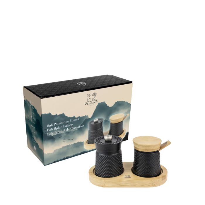 Soms wil je aan tafel nét dat beetje extra: iets dat mooi staat, fijn werkt en meteen sfeer geeft. Het Peugeot Bali Kruidenpaleis is precies zo’n set. Je krijgt een elegant bamboe dienblad met daarop twee blikvangers van zwart gietijzer: een pepermolen van 8 cm en een zoutkommetje van 7 cm met deksel en een delicaat bamboelepeltje. Alles wordt geleverd in een geschenkverpakking en komt leeg, zodat je zelf jouw favoriete peper en zout kiest.
